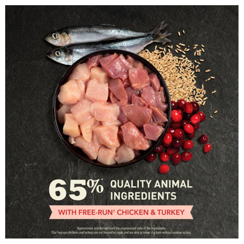Carne de pollo fresca (16%), carne de pollo deshidratada (16%), arenque deshidratado (16%), avena entera, guisantes enteros, grasa de pollo (5%), hierba miscanthus molida, lentejas verdes enteras, carne de pavo fresca (4%), arenque entero crudo (4%), garbanzos enteros, lentejas rojas enteras, fibra de lenteja, conejo crudo entero (1%), menudillos de pollo frescos (hígado, corazón) (1%), menudillos de pavo frescos (hígado, corazón) (1%), cartílago de pollo (1%), algas secas, calabaza fresca entera, calabaza butternut fresca entera, arándano rojo fresco entero, arándano azul fresco entero.
